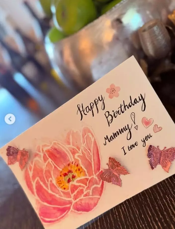 黎姿在IG分享捧着大束鮮花與生日蛋糕和生日卡的合照,並留言:「這個生日收到最珍貴禮物,是來自女兒們親手做的蛋糕和繪畫的生日卡,以及老公永不缺席的鮮花,這些窩心的愛,瞬間讓我心中湧起無盡的溫暖。這個特別的日子不僅是慶祝自己的生日,更是慶祝我們之間深厚的親情。願我們都能在愛中成長,幸福常伴。」不少圈中好友和網民都留言送上生日祝福!