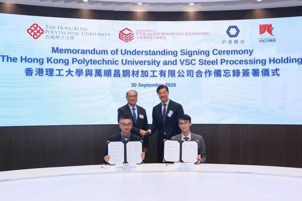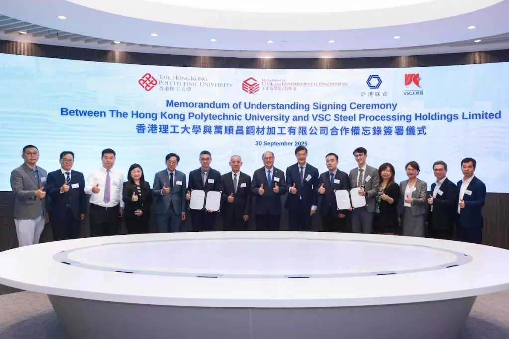 香港理工大學(理大)與萬順昌鋼材加工有限公司於9月30日簽署合作備忘錄,將於鋼筋追蹤技術研發領域展開深入合作,攜手推動本地建築業邁向智能化及可持續發展新里程。
