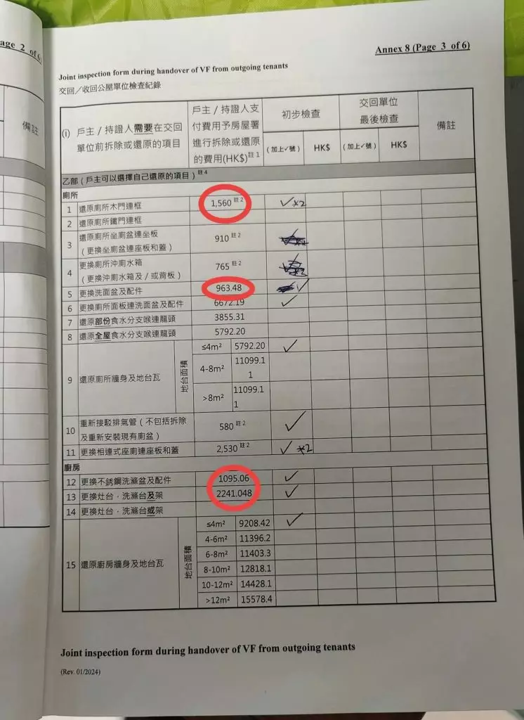 最意外的是,事主不但要承擔還原費用,就連「上手裝修」都要負責,「當時入伙廚房灶台、廁所洗手盆上一手已經改裝雲石台,房署問我屋企人要唔要接手我哋ok,而家交吉原來要照收還原費,廁所發黴爛咗自己換過都話唔係房署原裝門一樣要畀錢……」。