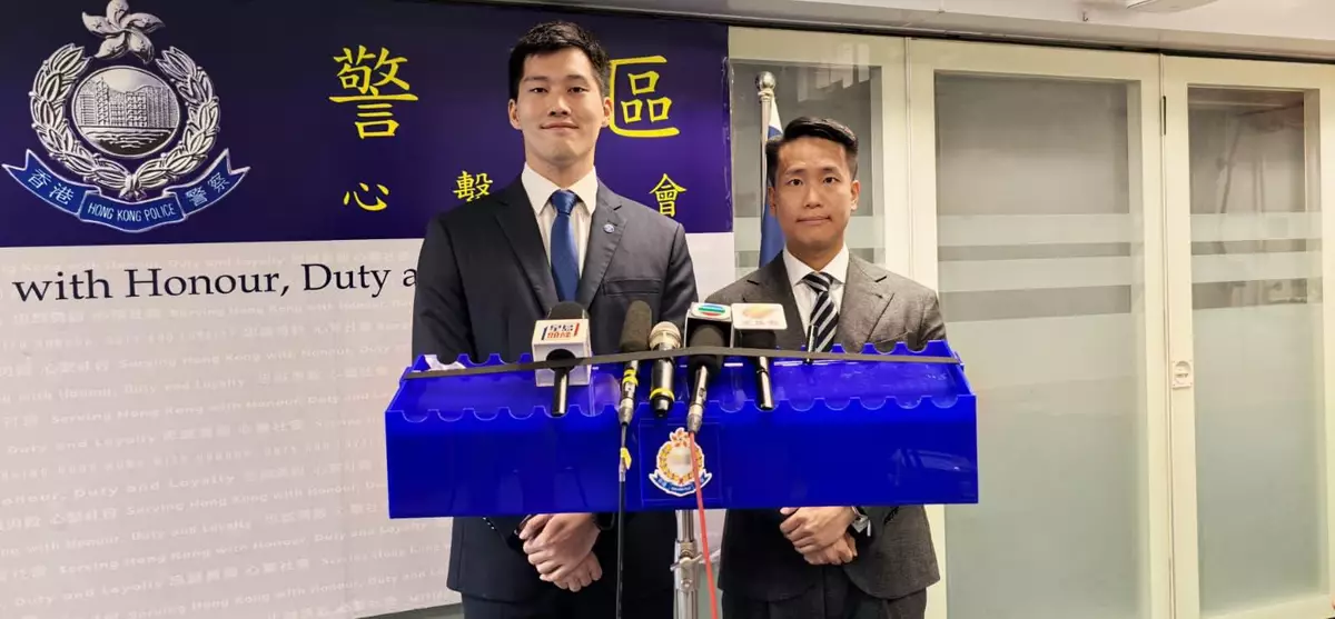 警方西區警區重案組高級督察郭愉勤(左)及商業罪案調查科反詐騙協調中心高級督察蘇傳禮(右)向傳媒簡報案情。