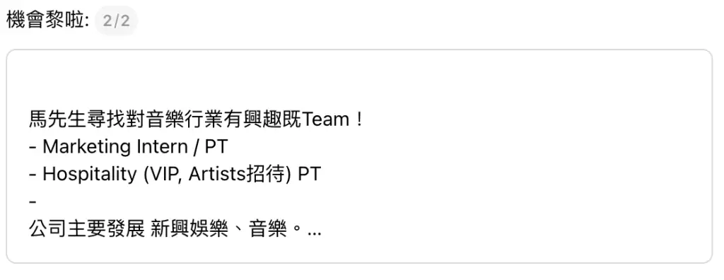 該老闆在「廢水報銷」帖文引發熱議後,迅速打鐵趁熱,在討論熱度高峰時加推招聘資訊,並幽默留言「機會黎啦」,公開招募對音樂行業有興趣的人才