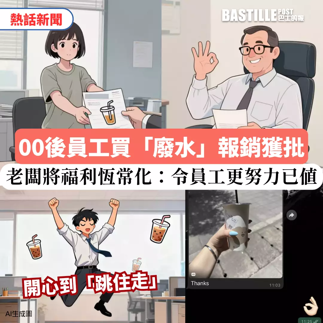 香港一名老闆近日在社交平台分享,因應00後員工提出報銷「廢水」(手搖飲品)的要求,並見證員工獲批後「開心到跳起」的反應,決定將此福利恆常化,事件引發網民的熱議。