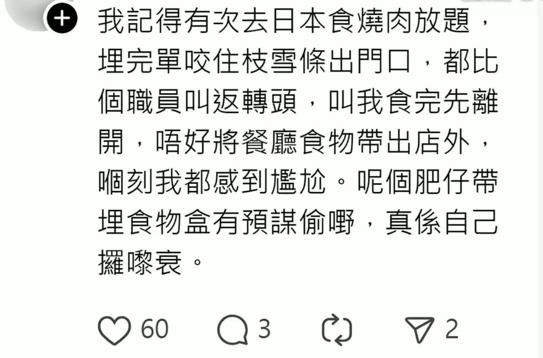 但都有網民試過被食肆職員溫馨提示,「記得有次去日本食燒肉放題,埋完單咬住枝雪條出門口,都比個職員叫返轉頭,叫我食完先離開」、「朋友試過拎雪糕,拎咗一次拎第二次已經被職員溫馨提示,『係咪攞咗啲雪糕呀?唔可以帶走架』。」