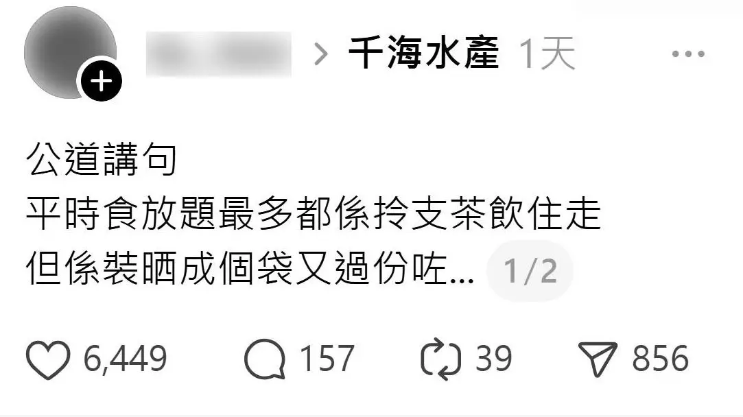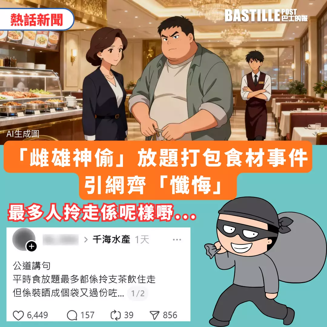 早前荃灣千海水產放題「雌雄神偷」打包食材斷正引起全城熱話,事件中男主角貪得無厭的行為令人乍舌!有網民在社交平台發文,指食放題「最多都係拎支茶飲住走,但係裝晒成個袋又過份咗.....」沒想到帖文卻引來大批網民「懺悔」,留言「告解」平日光顧放題時取走的物品........