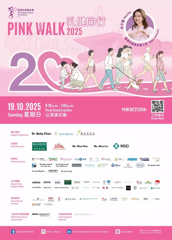 香港乳癌基金會(基金會)年度慈善步行籌款盛事「乳健同行2025」將於2025年10月19日(星期日)早上8時30分至下午1時正,在港島山頂舉行。活動所籌得的善款將用作支持基金會服務,包括推廣乳健教育、為乳癌患者及家人提供支援,以及乳癌研究及倡議等工作。