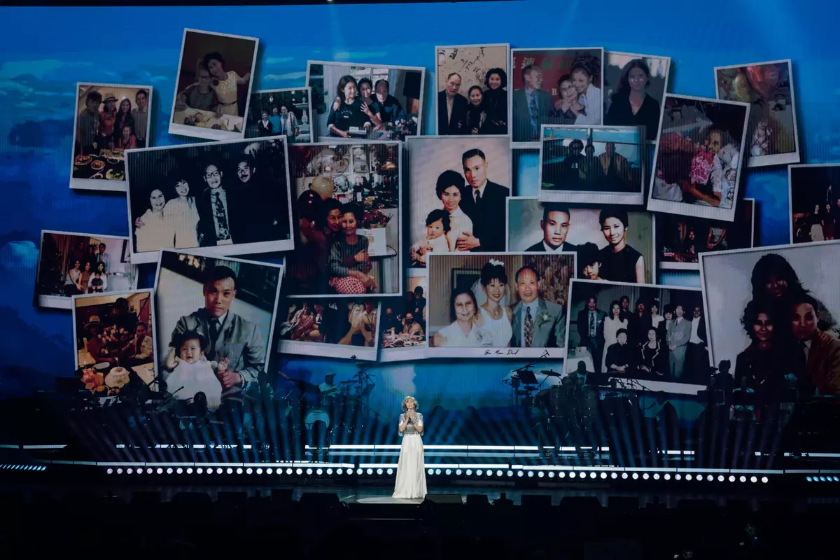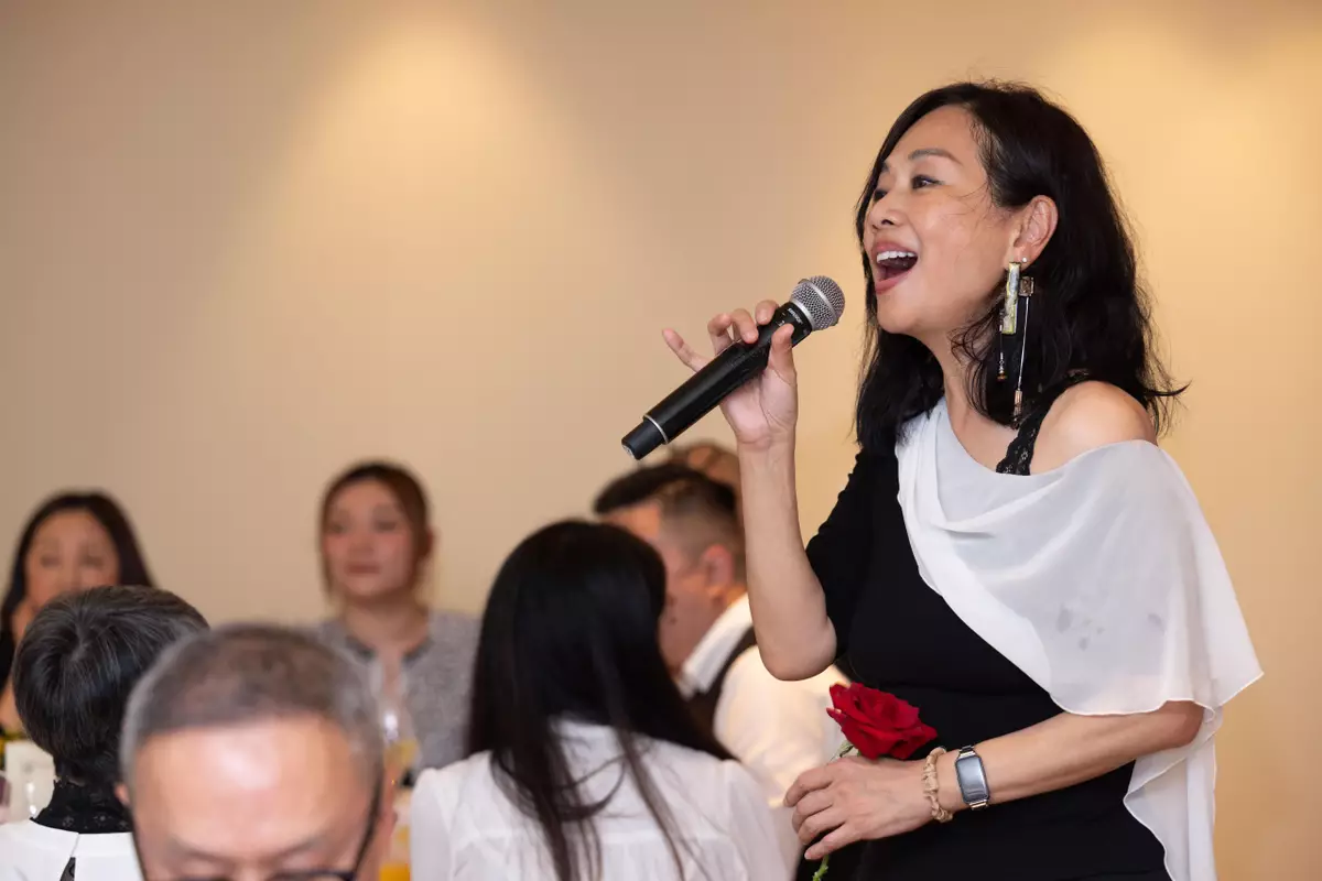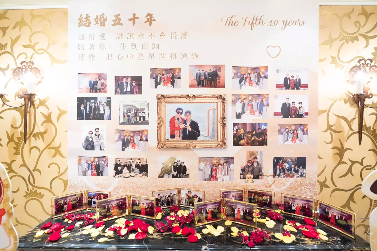 陳太於晚宴正式開始前對大家說:「真的很開心和感動,今天可以和大家在這裡相聚,相信大家也知道真的不容易,今次舉辦這個Party時間有點趕急,其實兩年前便有計劃在今天舉辦Party,但這個想法在去年開始便一直在延後,因為大老爺在跟演唱會走埠中,不知道他的行程如何編排,所以很難去落實計劃和訂場地。原本今天打算飛去大老爺工作的地方和他度過這個金婚紀念日,但有兩位好朋友包括拉姑和Simon Tse一直追問我們如何慶祝?他們強調因為是50年,所以一定要攪。」陳太續說:「我跟他們說如果要攪,那要看天意了,因為在香港我的首選便是半島酒店這個地方,我60歲時曾在此舉行Party,當時非常開心,所以當我們向酒店查詢能否租用?答案是可以,因另一常客剛剛改了常規計劃,今年有期,這真的是天意。原本我見時間那麽急,只想簡單請大家到來一起相聚吃一頓飯,但Simon說如我沒特別安排,那麼便由他來安排。大家由出電梯口,一路所看到的佈置,露台的backdrop和LED等都是他的心思,他什至乎在外地休假時,依舊親力親為不停和製作團隊通電話,看如何把今晚活動做到最好。」「今天很開心可以約到大家,在國慶日假期選擇來這裡,見證及分享我們50周年金婚這重要難忘的一刻。」
