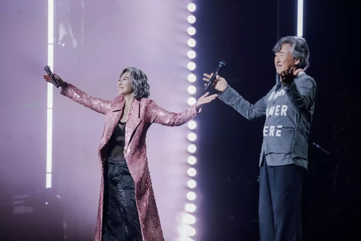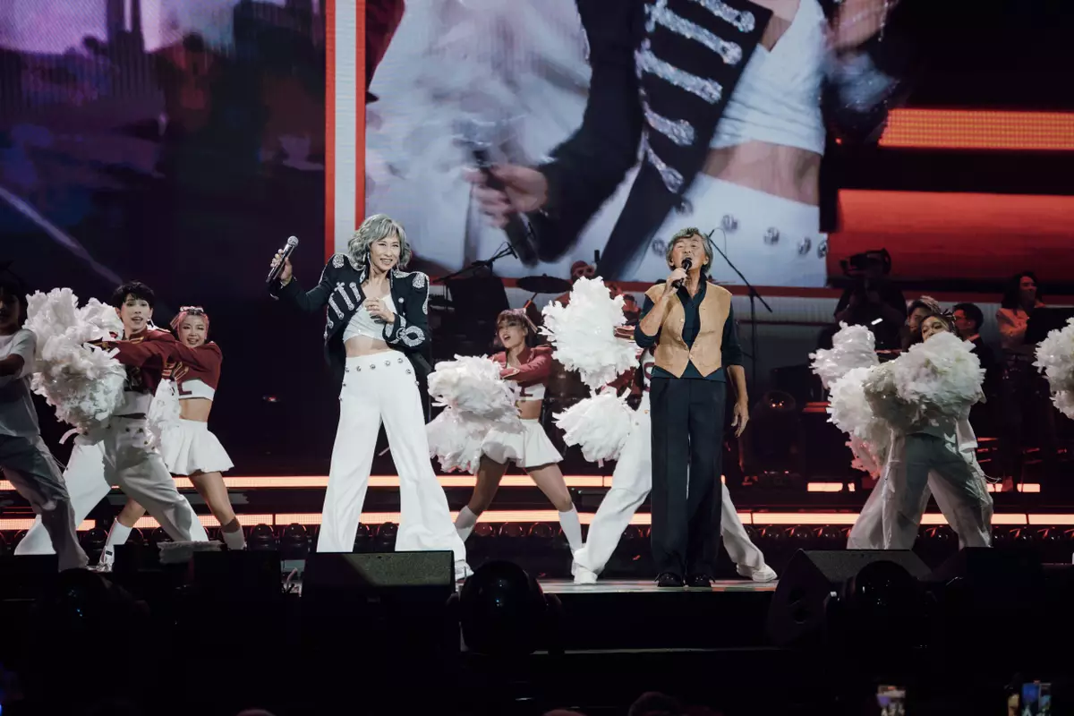 在陳太和大老爺合巹交杯後晚宴正式開始,陳太的弟弟Thomas、張智霖、蔡一智和張鐸在外地,也預先錄製了視頻恭喜主人家,鄭欣宜則很有心送上蛋糕祝賀,及後的至親好友的分享和遊戲環節中,大家最感興趣的便是他倆的結識和相處經過,眾人不約而同妙語連珠,令現場氣氛既溫馨又搞笑。當Bob問及陳太會以什麼動物去形容大老爺,陳太笑說:「今日你問我就覺得佢唔係似動物,係似Labubu咁可愛。」大老爺說:「唔怪之得妳成日叫我買Labubu。」陳太:「你成日去咗返工,你放多啲Labubu係屋企,就好似見到你咁囉。」接著修哥唱歌助興,修哥說:「大家相處50年真的不容易,所以一開始嘅時候就有啲情花,情花一開大家就開始。」唱畢《情花開》後,修哥祝願大家人月雙圓並送上一曲《月亮代表我的心》;大老爺也在徇眾要求下獻唱《只想一生跟你走》,現場歡呼聲不斷;工作後趕過來祝賀陳太和大老爺的張與辰也表演了《The Way You Look Tonight》和《我只再乎你》,陳太也順道公佈邀請了與辰為陳松伶撰寫新歌,陳少棋填詞,為何會有這個配搭:「因為明年2月28號我便會為陳松伶舉行演唱會,很榮幸請了與辰做音樂總監,真的很期待,希望大家到時捧場。」;松松獻上了一曲《但願人長久》,唱罷她搞笑表示一定要減肥去預備演唱會;黃洛妍也有前來獻唱祝賀。在晚宴接近尾聲時,陳太笑說:「今晚酒微菜薄,希望大家玩得開心,多謝修哥、Owen哥、松松、張與辰和Janees為我們唱歌,多謝Simon大將軍和拉姑,好多謝大家今日光臨,今晚晚宴時間比較長,大家不要介意,希望看到煙花匯演可以作為補償。」