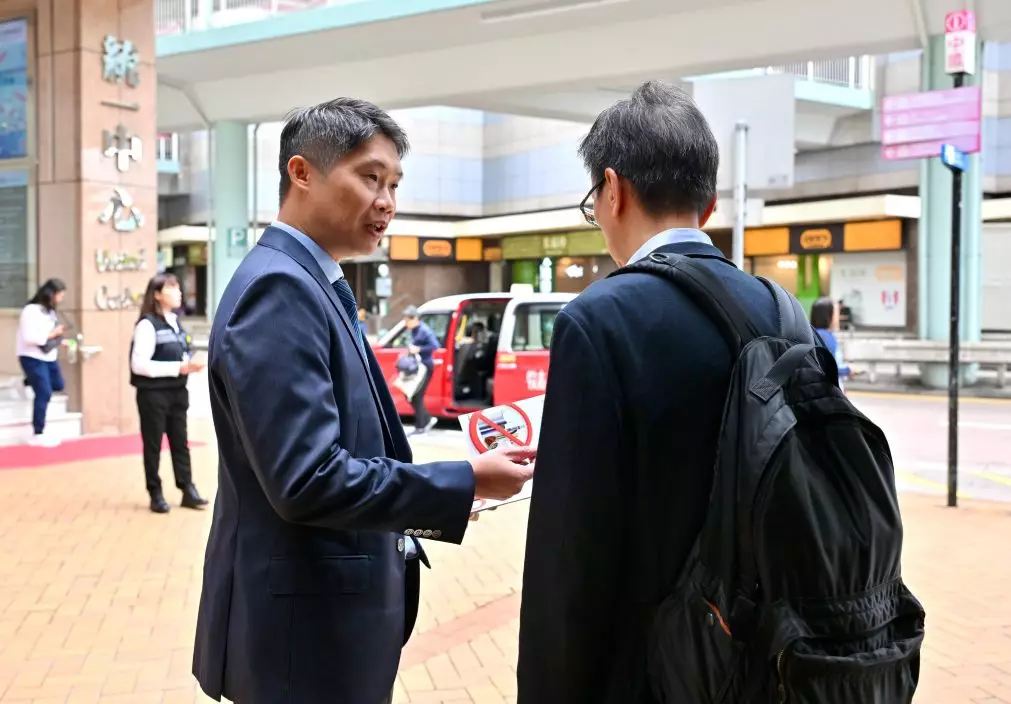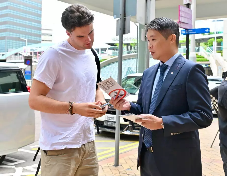 禁止在公眾地方管有指明另類煙的規定4月30日生效,圖示衞生署控煙酒辦公室主任林民聰於金鐘向市民及旅客派傳單,宣傳有關禁令。政府新聞處圖片