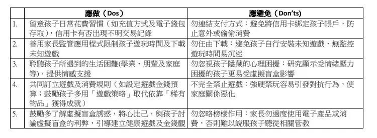 同時,他建議學校及社區建立保護網絡,定期關注學生情緒及虛擬盲盒參與情況,及早辨識高風險青年並提供適切支援。家長若察覺子女出現沉迷跡象,宜尋求專業協助,了解成癮背後成因,避免以單一禁止方式處理。他為家長在應對子女提出五項應做及應避免(Dos & Don’ts)建議: