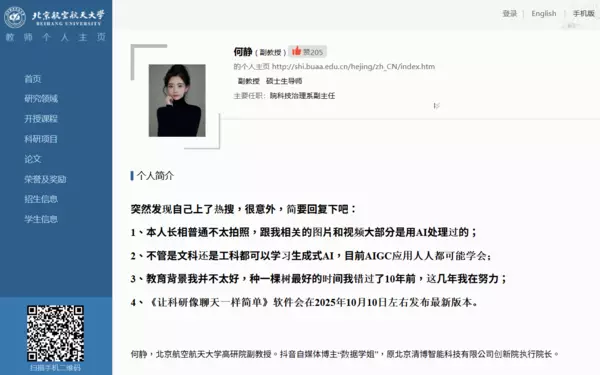 隨著人氣上升,何靜於北航教師個人主頁發文回應,指「突然發現自己上了熱搜,很意外,簡要回覆下吧:本人長相普通不太拍照,跟我相關的圖片和視頻大部分是用 AI 處理過的」。她同時提到,「不管是文科還是工科都可以學習生成式 AI,目前 AIGC 應用人人都可能學會;教育背景我並不太好,種一棵樹最好的時間我錯過了 10 年前,這幾年我在努力」。