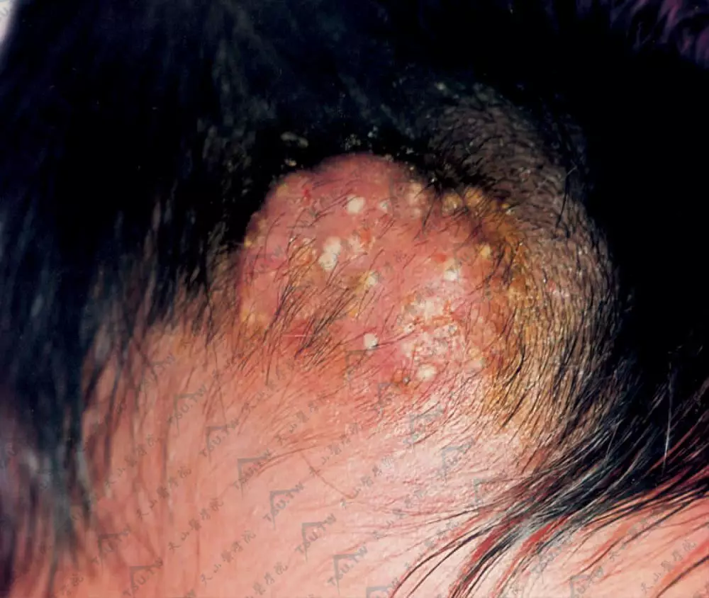 該名男童因頻繁接觸家中兔子,頭皮出現真菌感染形成膿癬。微博圖片