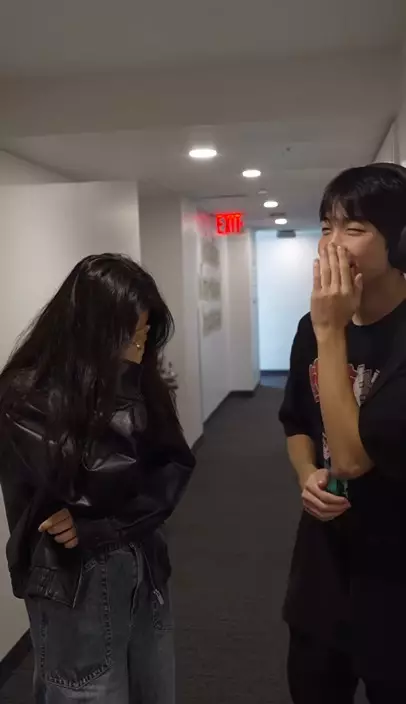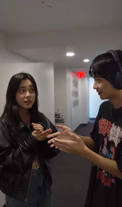 影片中,姚焯菲負責猜歌,由同學用廣東話唱出歌曲。其中一位同學Calvin,用「不鹹不淡」的廣東話賣力演唱,雖然聽起來有些吃力,但逗趣的發音卻瞬間點燃全場笑點,不僅讓姚焯菲笑到崩潰,連鏡頭後的攝影師Ryan也笑得樂不可支。