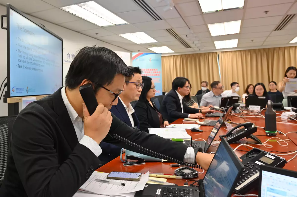 演習模擬在賽事期間接獲涉及運動會相關人員的懷疑食物投訴及中毒個案。食環署隨即按《應變計劃》全面啓動緊急協調中心,迅速在相關食肆作出調查,並採取控制措施,保障食物安全。緊急協調中心亦同時協調與統籌辦及其他相關單位的通報及協作。