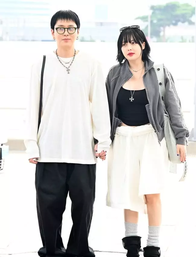 泫雅與龍俊亨拖手現身仁川機場。網上圖片