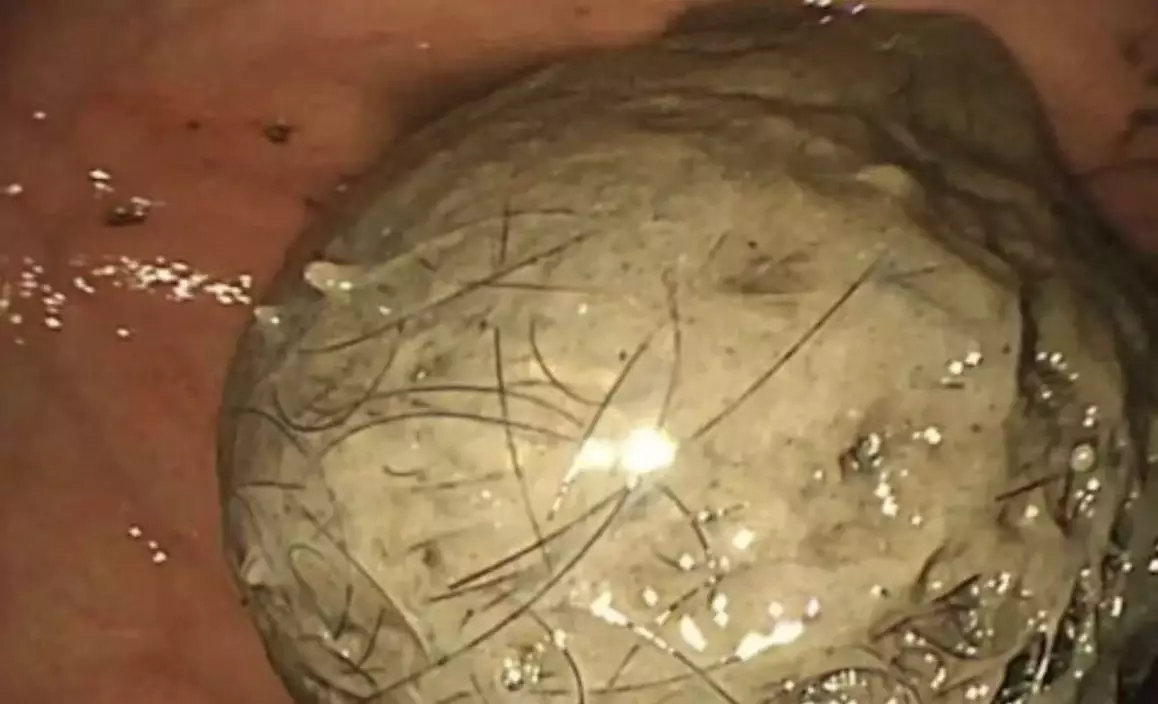 檢查結果顯示,小可確診為罕見的「長髮公主綜合症」。因為愛吃自己的頭髮,導致胃部塞滿成團得毛髮,幾乎佔據胃容量的四分之三,這些不能消化的物質在胃酸作用下逐漸發生變性,與食物結合形成堅硬「胃石」。
