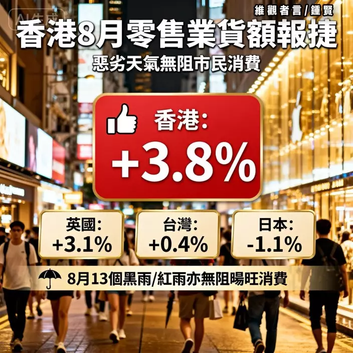 政府統計處最新數據顯示,香港8月零售業銷貨額按年上升3.8%,比7月上升1.5%,銷貨額較遠勝7月。8月天氣不似預期,單月曾發出13個黑雨或紅雨訊號,又曾於4日內3次發出黑色暴雨警告;但數字說明,天氣無阻市民和遊客繼續購物花費,而暑假旺季8月銷情更勝7月。