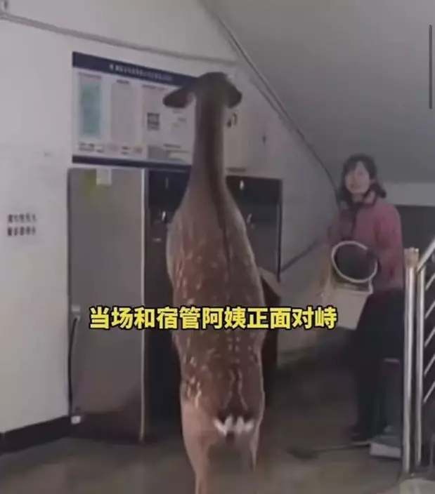 四川院校一隻梅花鹿闖入女宿舍雙腳站立與宿管阿姨「對打」,學生一聲尖叫反將牠嚇跑。