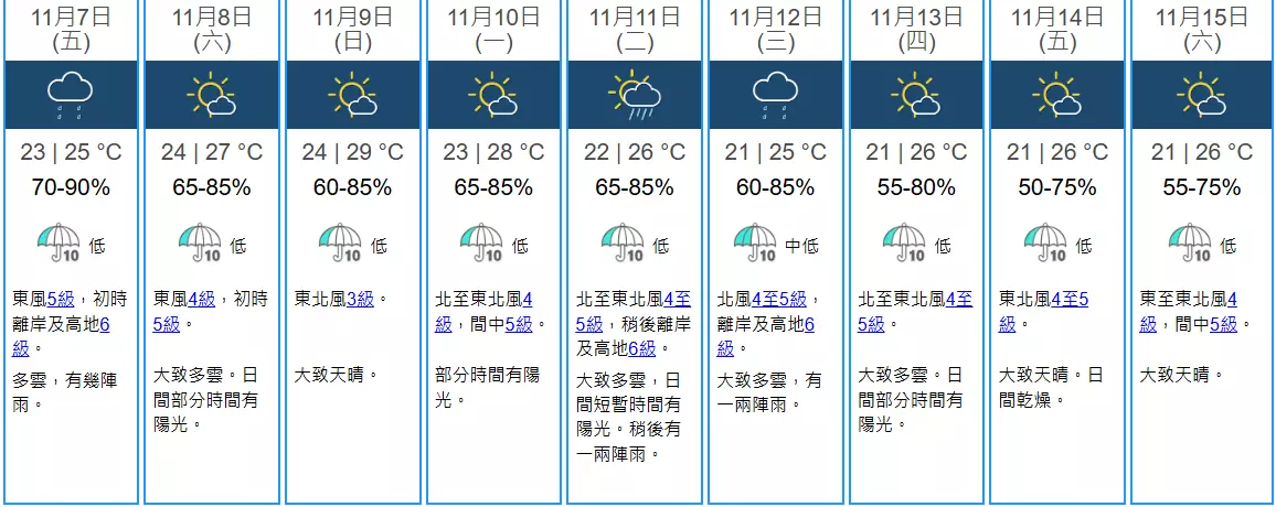 本港地區星期五天氣預測,多雲,有幾陣雨。日間氣溫徘徊在24度左右。吹清勁偏東風,初時離岸及高地吹強風。