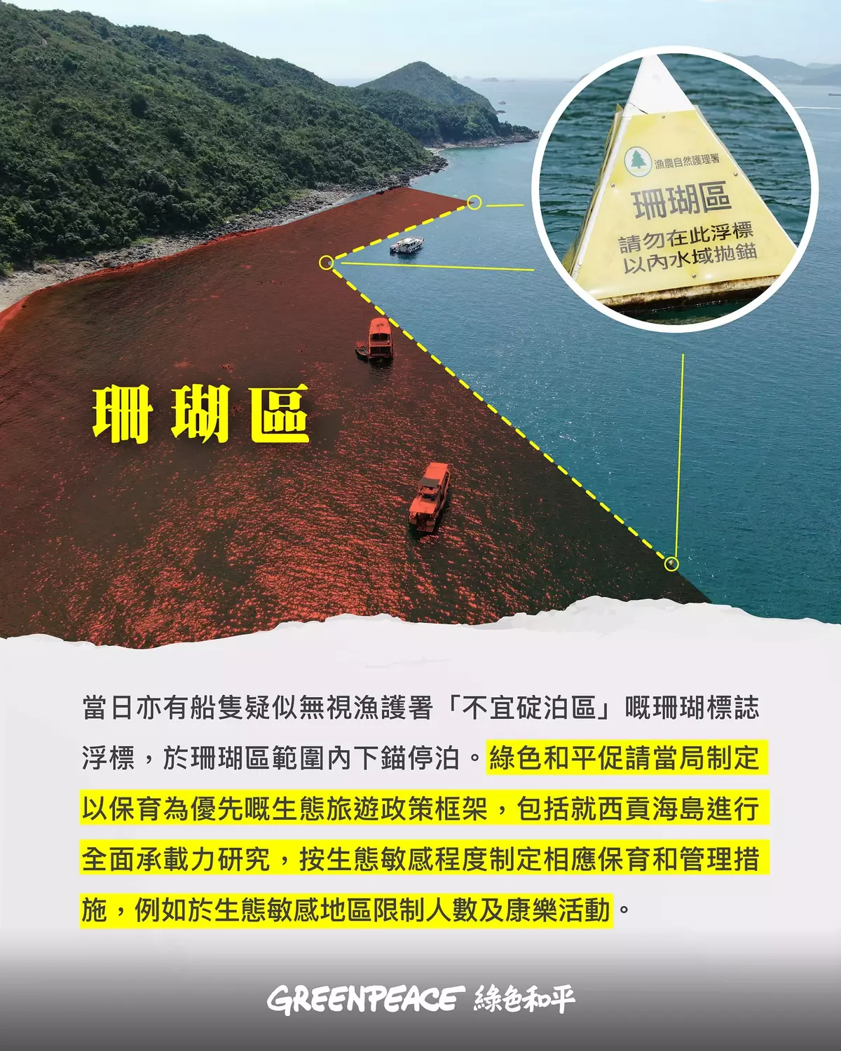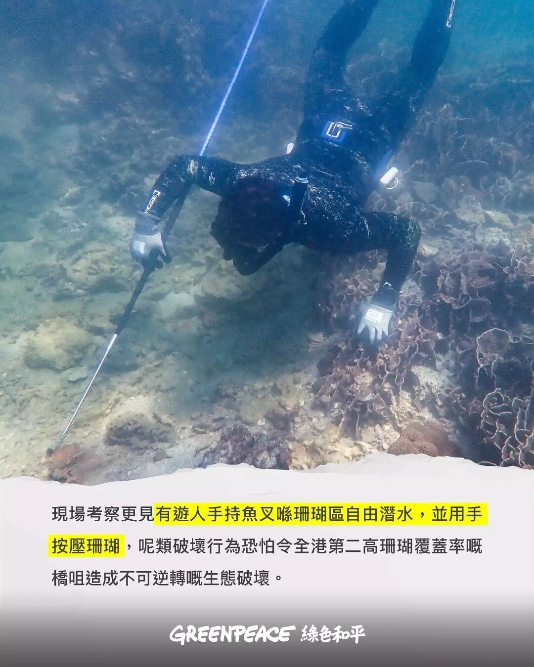 綠色和平稱,見到有人穿著運動鞋在珊瑚上行走同跳動、手持魚肉腸餵食、手持魚叉潛水並按壓珊瑚借力,以及有船隻疑似無視漁護署「不宜碇泊區」珊瑚標誌浮標,於珊瑚區範圍內下錨停泊。
