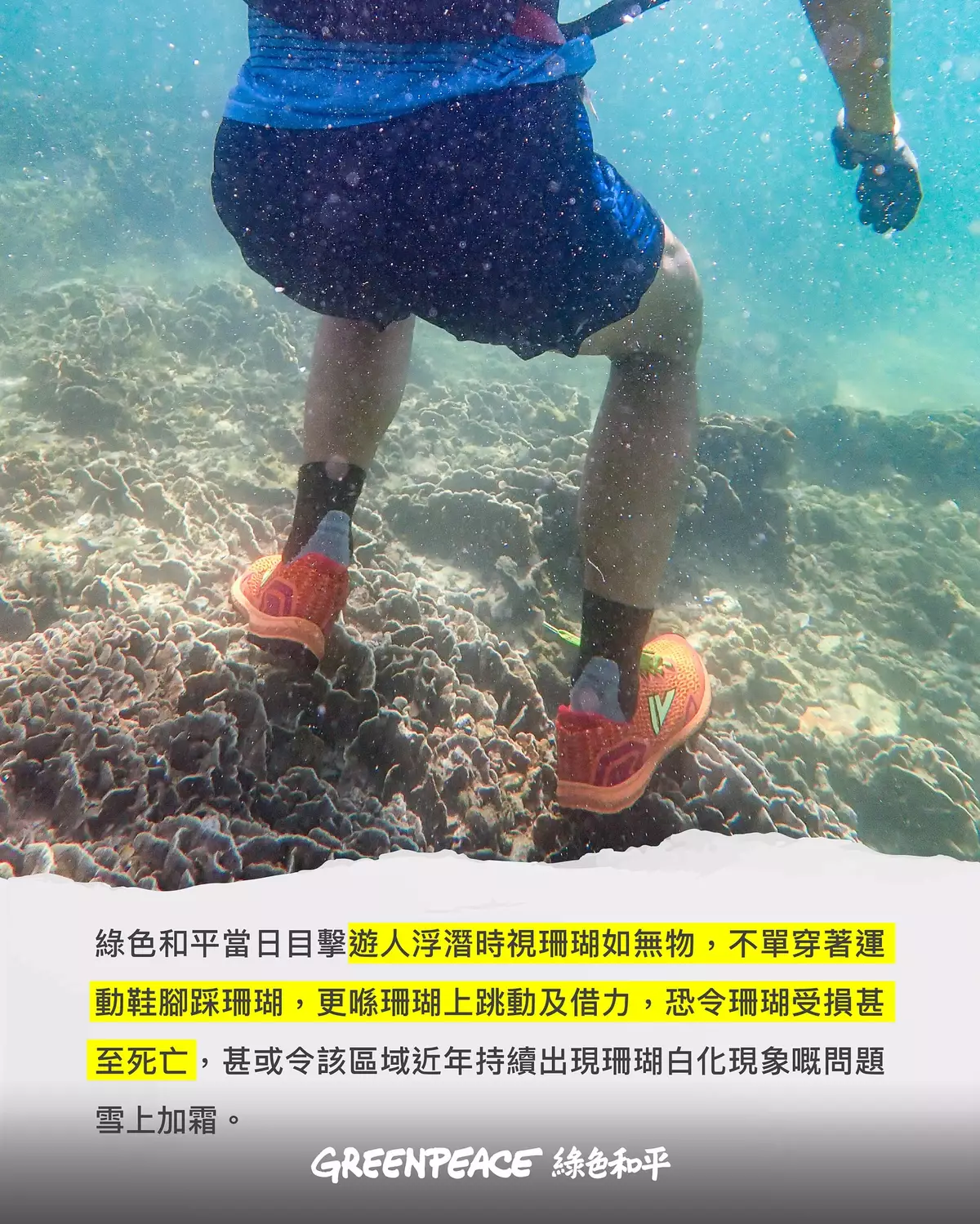 綠色和平指,浮潛客踐踏珊瑚,除有機會踩斷甚至踩死珊瑚外,更有可能令該區域近年持續出現珊瑚白化現象的問題雪上加霜。