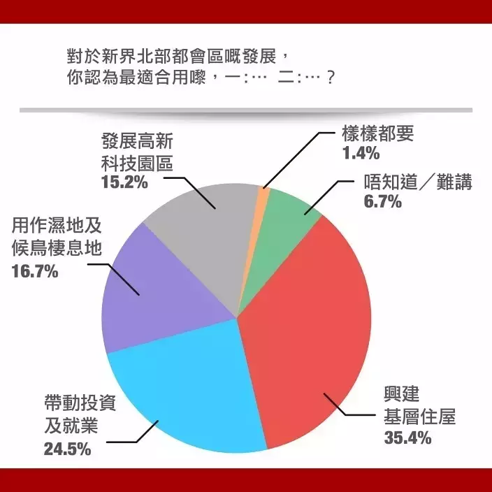 民調又顯示,針對北都的發展,認為應興建基層住屋的被訪者佔最多達35.4%.