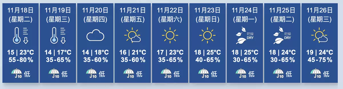 天文台預料,廣闊的雲帶在本周後期會轉薄,同時東北季後風亦會逐漸緩和,天色會好轉,氣溫會逐步回升,但早上天氣仍然清涼。署理助理台長謝淑媚提醒市民、要準備適當的保暖措施。
