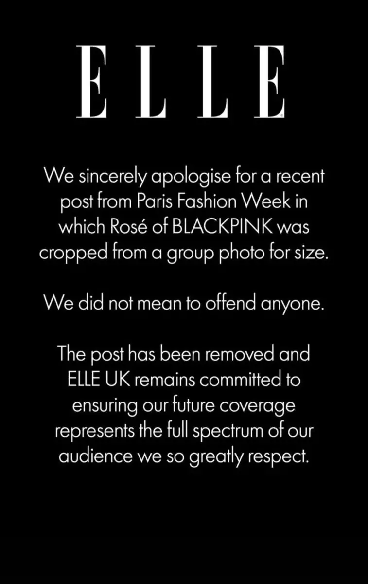 面對全球的輿論壓力,英國雜誌《ELLE UK》於當地時間10月2日透過Instagram限時動態發表道歉聲明,稱裁切照片僅因「尺寸考量」,強調「無意冒犯任何人」,並隨後上傳Rosé的單人照,承諾未來將更注重多元呈現。然而,這份聲明不僅未平息爭議,反而被粉絲批評「毫無誠意」、「事後補救太遲」。網友指出,Rosé自2020年起擔任聖羅蘭全球大使,且於2025年成為聖羅蘭美妝全球大使,如此「失誤」難以令人信服。
