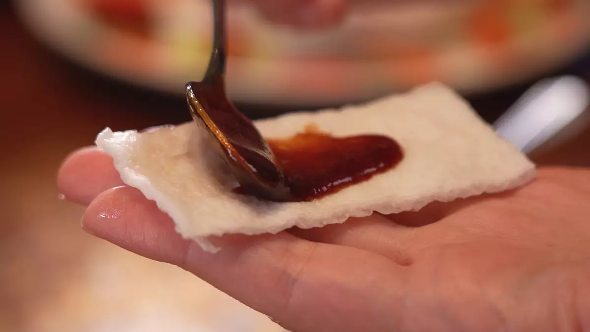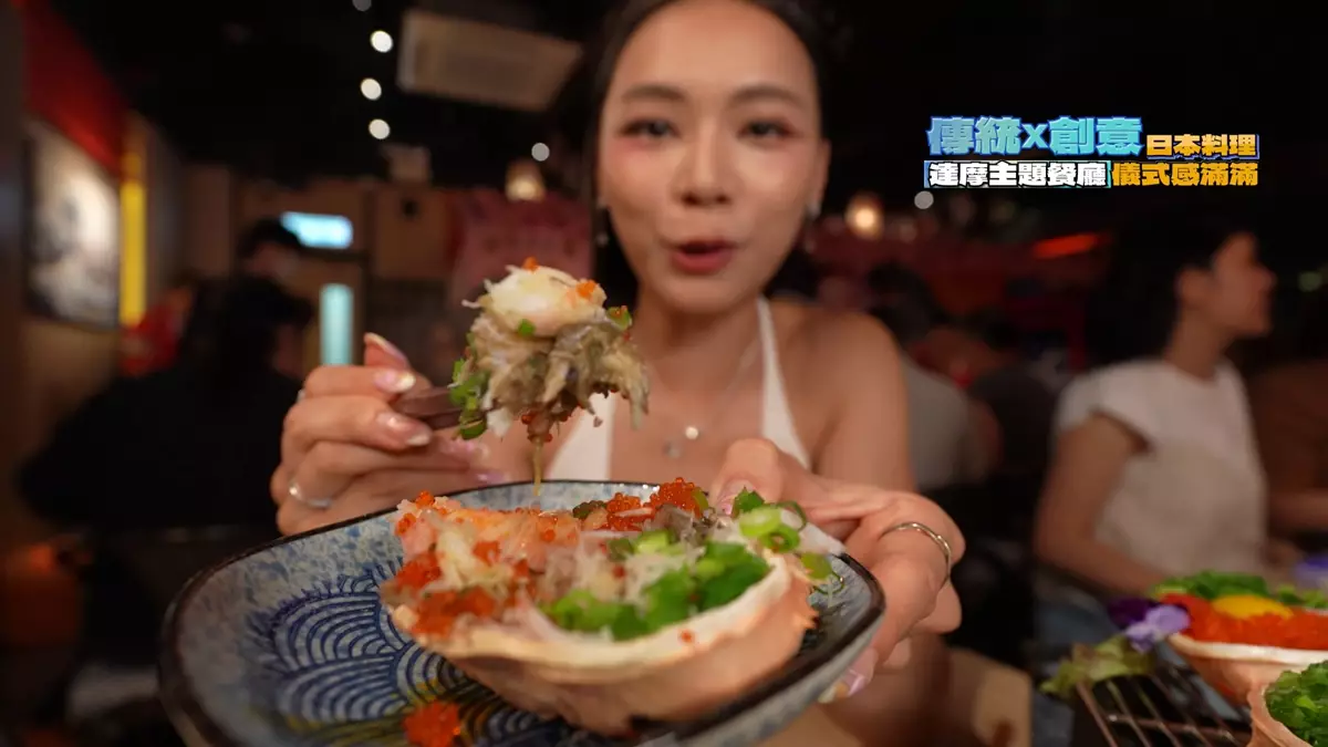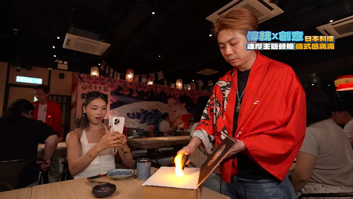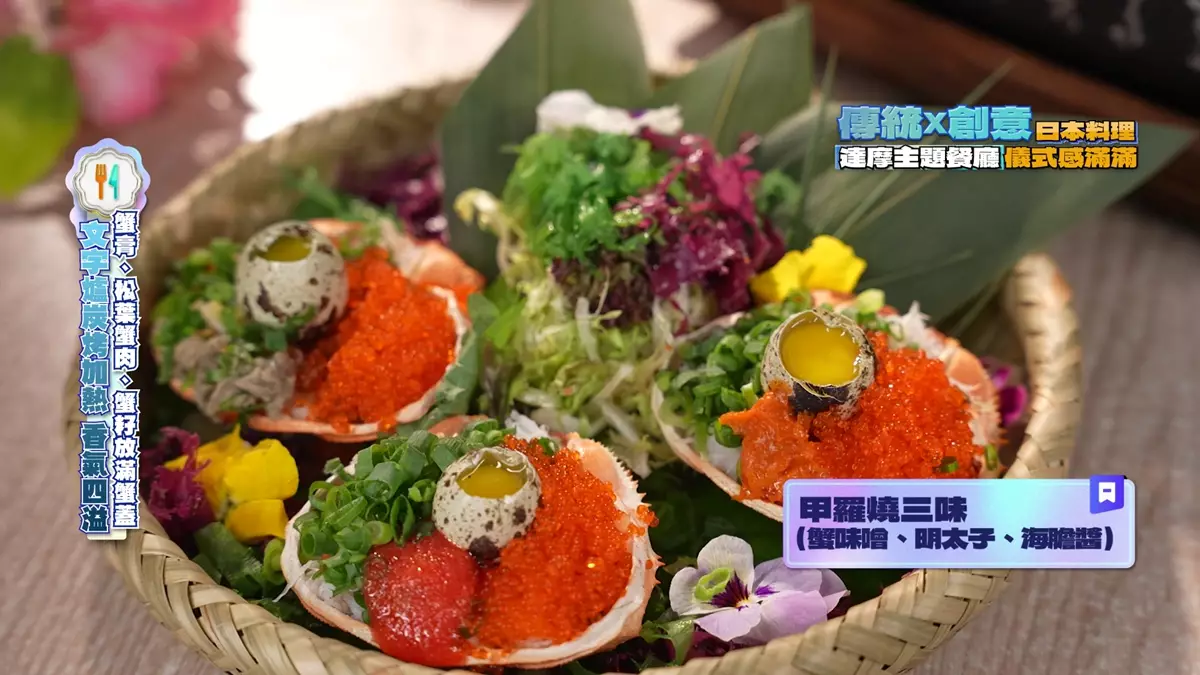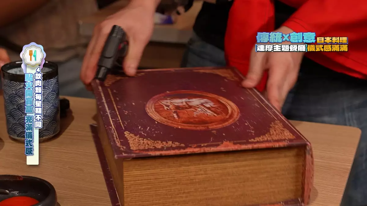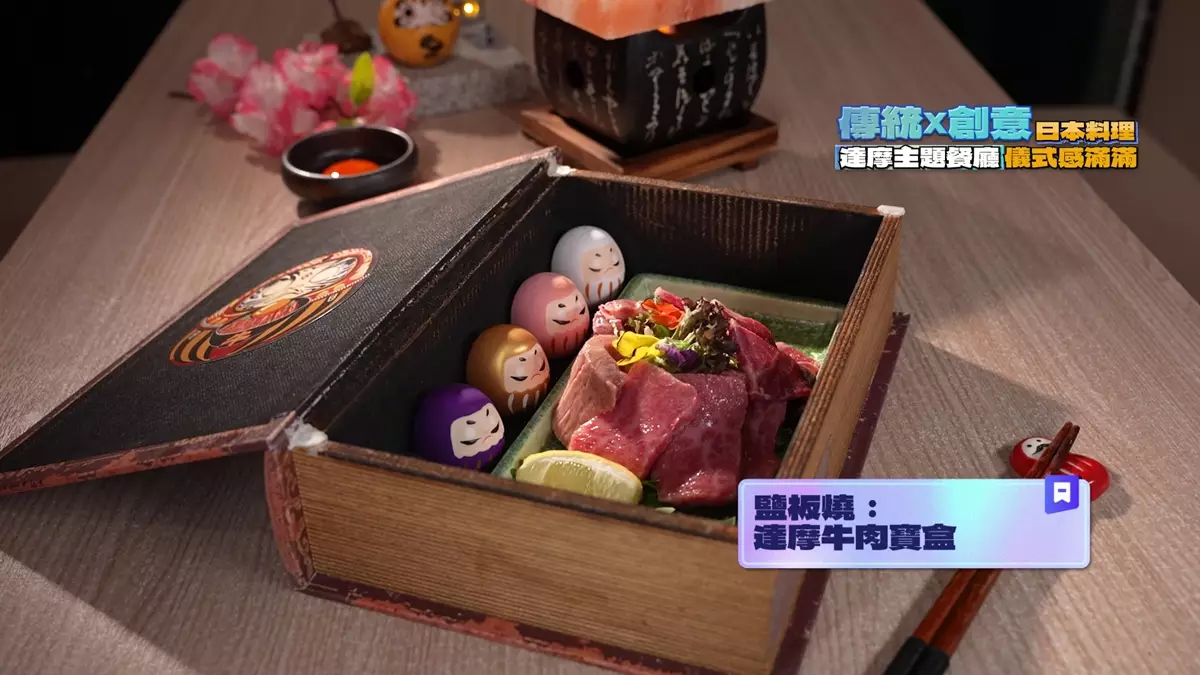 此外,今晚廖慧儀(Jessica)介紹一間位於旺角的爐端燒居酒屋,標榜每道菜都色香味俱全,是打卡拍照的好去處。Jessica先在餐廳門口的「達摩許願牆」,寫下「《美食新聞報道》長做長有,自己可以帶大家食多啲好嘢」的宏願。餐廳老闆先後為她點了達摩牛肉寶盒、甲羅燒三味及達摩天丼。單是一款牛肉寶盒,要點火燒去遮面的紙,才露出內裏乾坤。儀式感十足。