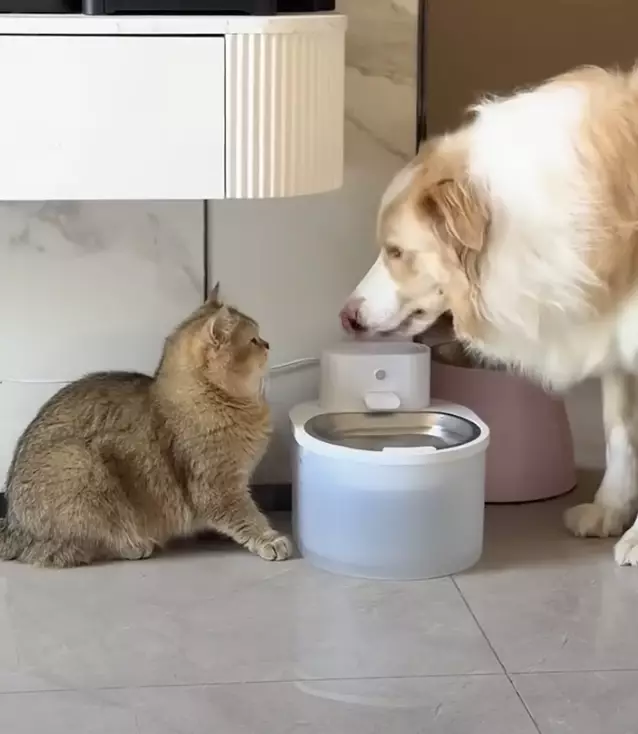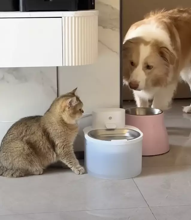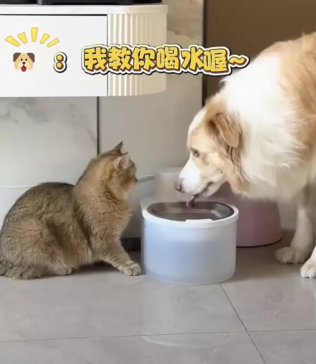 原本家裡就有一隻邊牧狗狗,邊牧發現家裡來了新同伴,就非常熱心帶貓貓到自動飲水機前面教牠如何喝水。