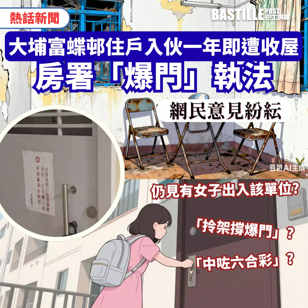 政府加強打擊濫用公屋,大埔富蝶邨珍蝶樓有單位入伙僅一年,即被房屋署張貼「收回公屋」告示,更有住戶目擊工作人員需「爆門」入屋,事件引發許多網民對收樓原因的猜測。