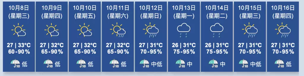 預料本港地區星期三大致天晴。日間酷熱,市區最高氣溫約33度,新界再高一兩度。吹微風,漸轉吹和緩東至東北風。展望未來一兩日大致天晴。週末期間部分時間有陽光,有一兩陣驟雨。