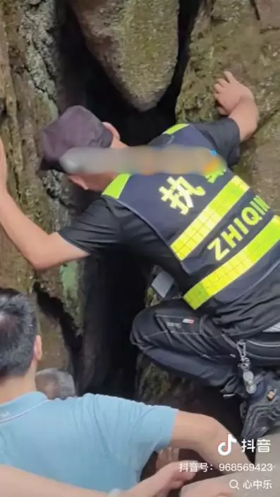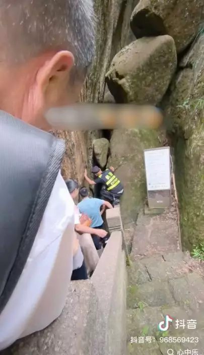 90KG男遊客挑戰遊福建太姥山狹縫慘被卡住勁尷尬。影片截圖
