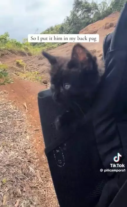 夏威夷一名女子帶寵物犬健行偶遇親人小黑貓,放進背包同行5小時後終決定暖心收編。