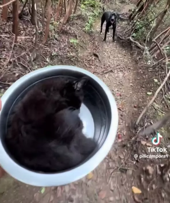 影片可見,女子將小黑貓輕輕放入背包內,而拉布拉多犬對小貓也完全不排斥,二者相處融洽。抵達瀑布時,牠們更一同玩水嬉戲,氣氛溫馨。回程途中,小黑貓則蜷縮在寵物碗中安然入睡,模樣惹人憐愛。