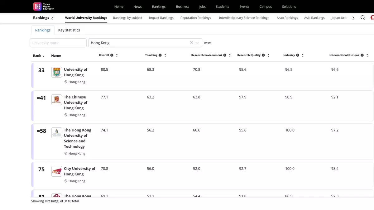泰晤士高等教育(THE)最新大學排名出爐,本港八間資助大學全部上榜,六間院校打入200強。網站截圖