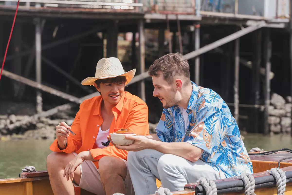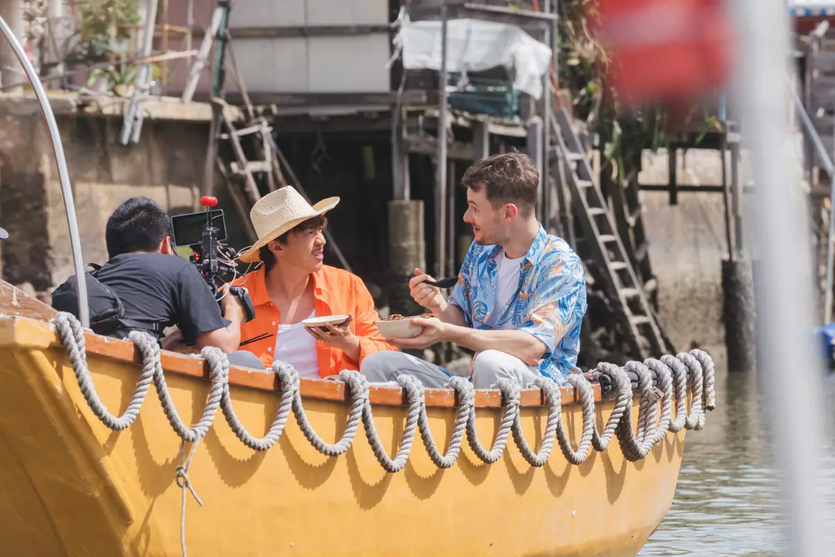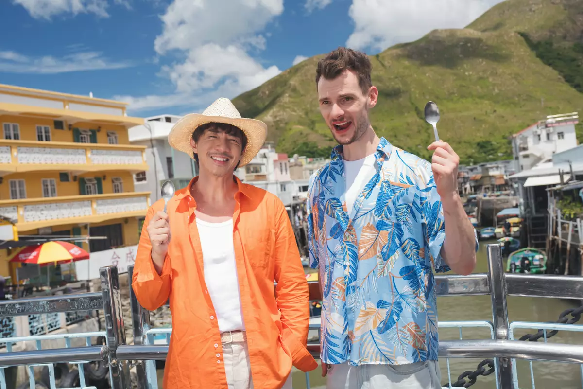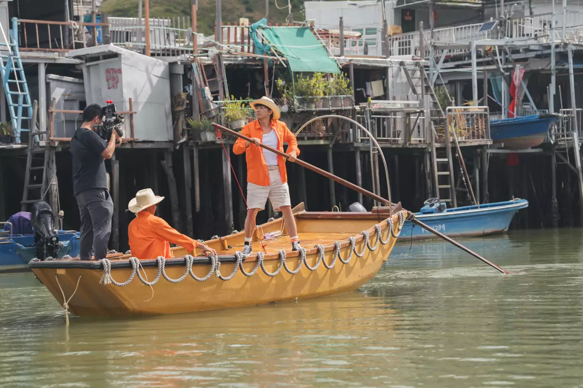 張繼聰與「鬼佬陀地」澳洲仔Brendan到大澳水鄉拍攝大快活全新宣傳片。