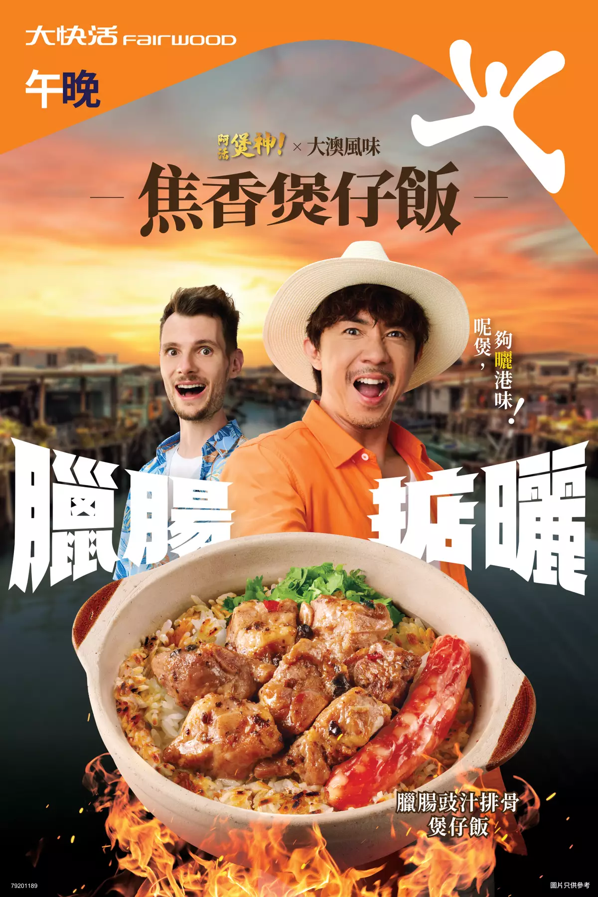 為了將獨特港味發揮得淋漓盡致,大快活誠邀張繼聰及「鬼佬陀地」澳洲仔Brendan到大澳水鄉拍攝全新宣傳片,好戲之人阿聰化身型佬船家「蝦佬聰」,帶領Brendan穿梭大澳打卡景點展開一段「尋找美食的故事」,發掘集齊焦香、油香與鮮味的地道美食,而以「大澳益昌」名物炮製的「臘味片魷魚筒鱆魚肉餅煲仔飯」,正正令Brendan食指大動,心滿意足地高呼:「呢煲真係『港』得『曬』呀!」