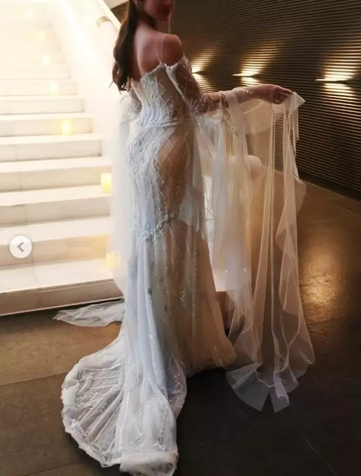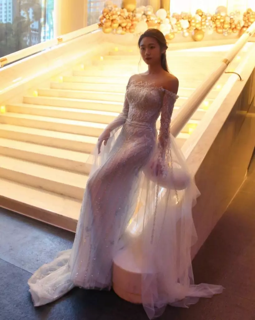 相片中可見,Jojo身穿Tube Dress晚裝,上身採用貼身剪裁設計,大騷香肩鎖骨;而下身裙擺則以輕盈透視薄紗打造,若隱若現展現其一雙逆天長腿,配合拖地婚紗式薄紗尾擺,整體造型宛如仙女下凡,氣質十足。