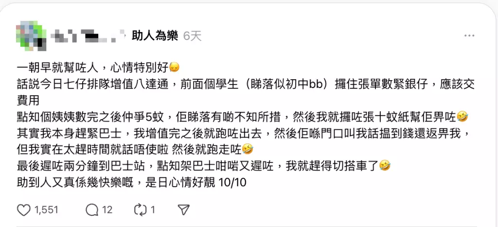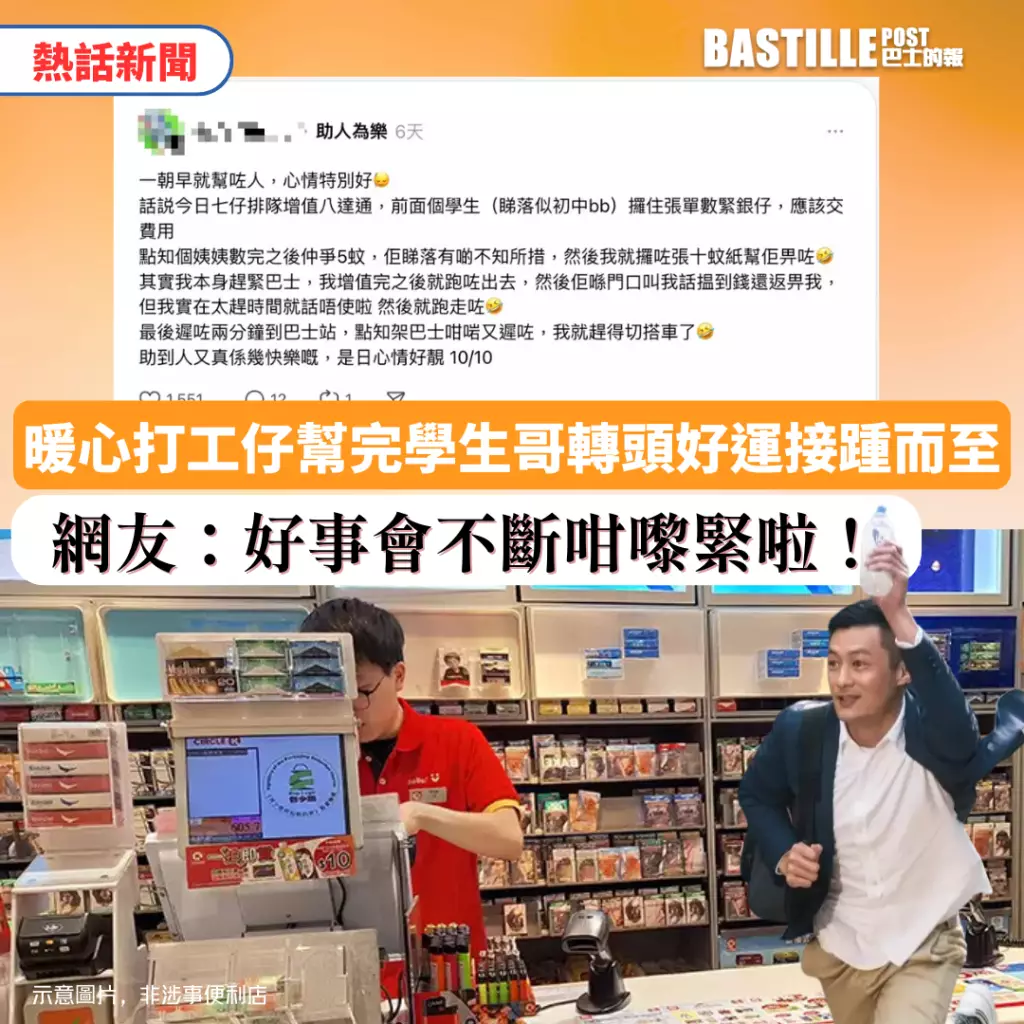 近日就有打工仔在社交平台分享自己在便利店的暖心經歷。事主在一個平常的返工日子到便利店增值八達通時,發現排在前面的學生付款時現金不足,店員告知尚欠5蚊,學生聞言當場不知所措,而事主見狀,隨即掏出10元助年解困。