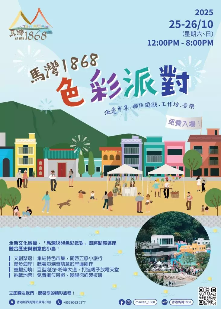 繼今年復活節「色彩派對」深受親子訪客的熱烈捧場,今秋10月將會繽紛再現「馬灣1868」,讓各位大人携同小孩,一起體驗樂趣無限的攤位與活動!「色彩派對」將於10 月25至26日舉行,適逢周末方便一家大小共享樂趣。
