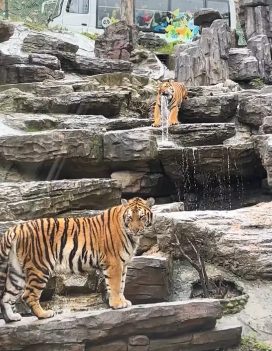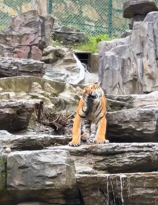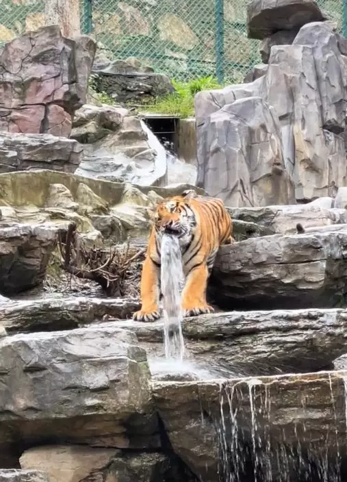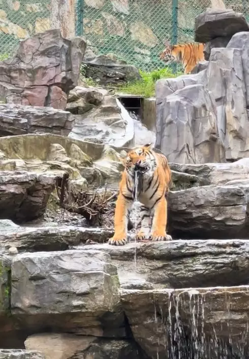 原來,這隻東北虎當時正咬住園區內的塑膠水管,水流沿管道湧出,乍看宛如從老虎口中傾瀉而下,形成「虎口瀑布」的景象。由於老虎長時間保持靜止,遊客最初誤以為是園區設計的老虎雕像,直到牠緩緩眨眼及擺動尾巴,眾人才意識到是真老虎。