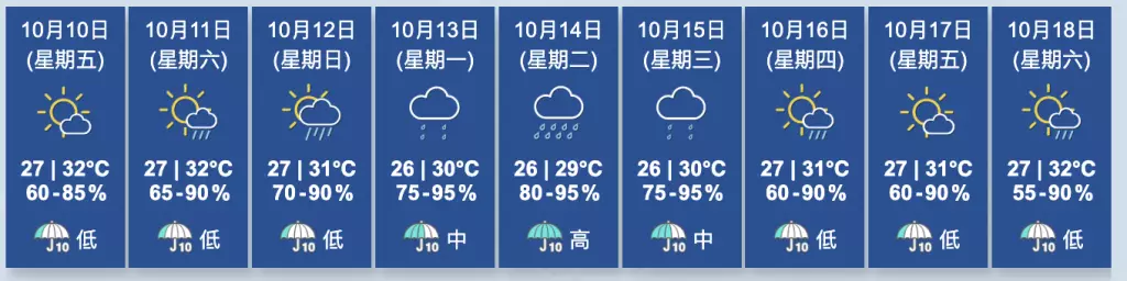 預料本港地區星期五大致天晴,但初時局部地區有驟雨,日間炎熱及乾燥,市區最高氣溫約32度,新界再高一兩度。吹和緩偏東風。