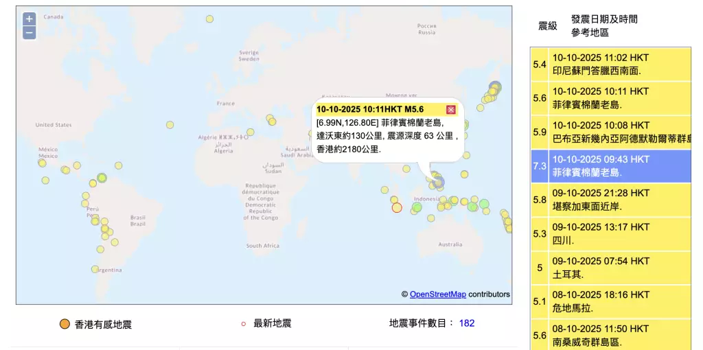 本港天文台指地震發生在早上9時43分,強度為7.3級,震央位於達沃以東約140公里,震源深度約10公里。