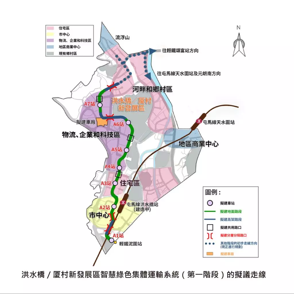 政府就洪水橋/厦村新發展區智慧綠色集體運輸系統(第一階段)道路工程建議方案刊憲。全長約4.5公里,擬設7個車站,連接泥圍和洪水橋/厦村新發展區內已規劃的物流、企業和科技區及住宅區,以及連接興建中的屯馬線洪水橋站、輕鐵泥圍站、規劃中的港深西部鐵路及區內的運輸交匯樞紐,以配合洪水橋/厦村新發展區的第二期發展。