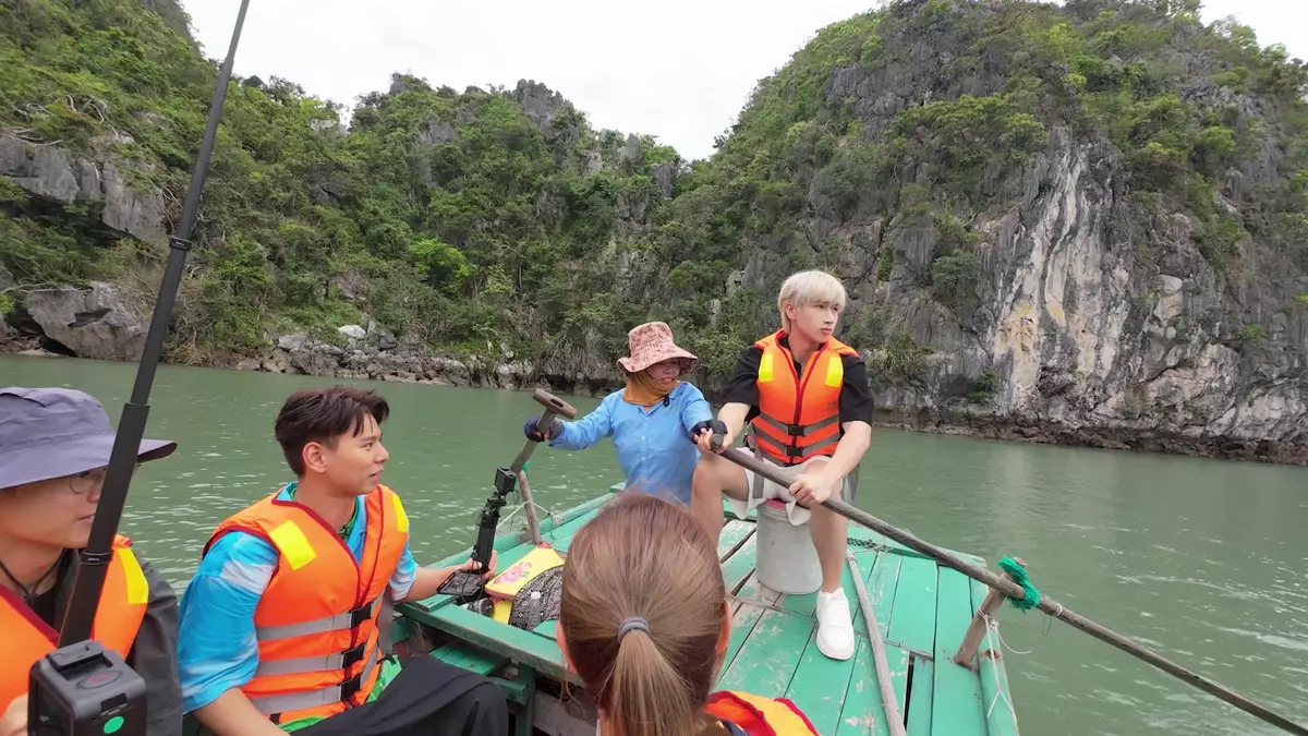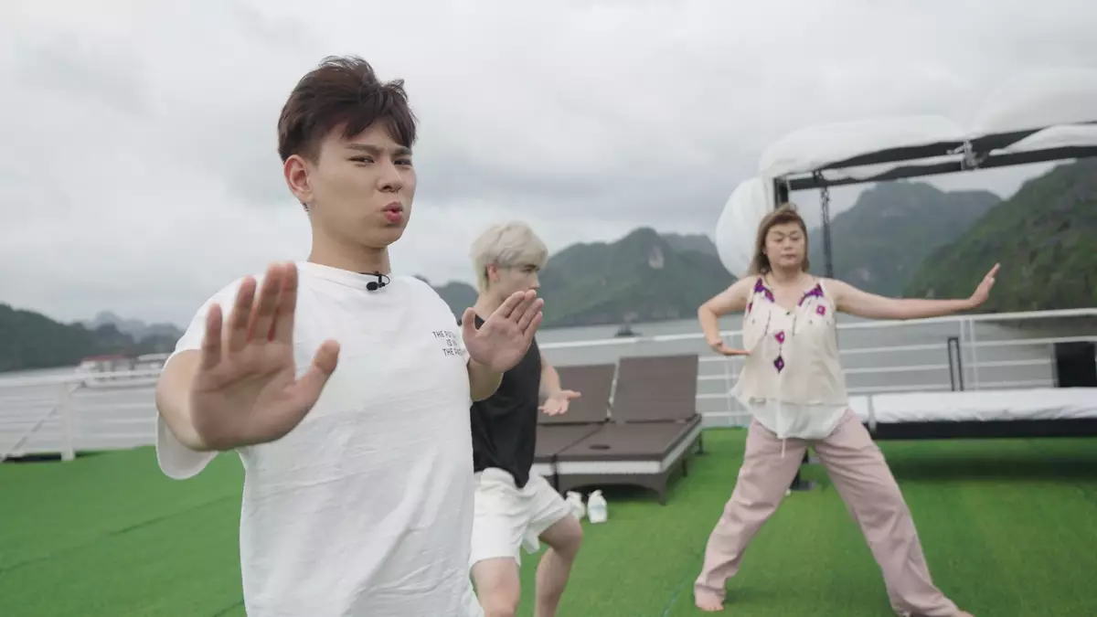 遊船途經多個景點,來到下龍灣他們轉乘木伐,遊覽當地著名的光明洞。洞穴經海水長年侵蝕石灰岩形成大大小小洞,高度只有2到4米,坐小船穿越其中,猶如上了一堂地理科。晚上他們下榻遊船,並享用豐富海鮮餐。第二朝一早嘉姐開班教授二人太極做早操。