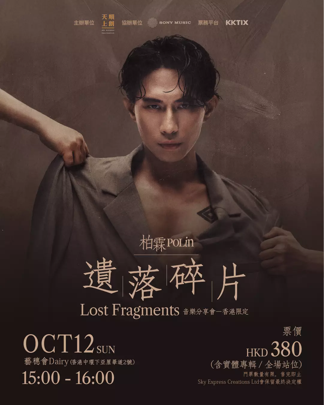 天生藝術家柏霖(PoLin)的創作專輯《允許萬物破碎》大獲好評,他也因此入圍金曲獎最佳華語男歌手,並乘著熱勢舉辦「允許萬物破碎」台北+台中專場演唱會,柏霖都帶來充滿藝術性的獨特舞台魅力和超強演唱實力的完美演出。柏霖每一次的專場演出都有多位香港歌迷特別從香港飛到台灣支持他,展現出柏霖在香港的人氣升溫,也因為在香港累積愈來愈多粉絲,他在日前受邀第一次前進香港舉辦《遺落碎片 Lost Fragments》音樂分享會,首次在香港與粉絲直接接觸,他以憾動人心的歌聲征服全場粉絲,更有忠實粉絲聽到感動落淚,讓柏霖直說:「能來香港開唱真的非常興奮,希望能有更多機會來唱歌給大家聽。」
