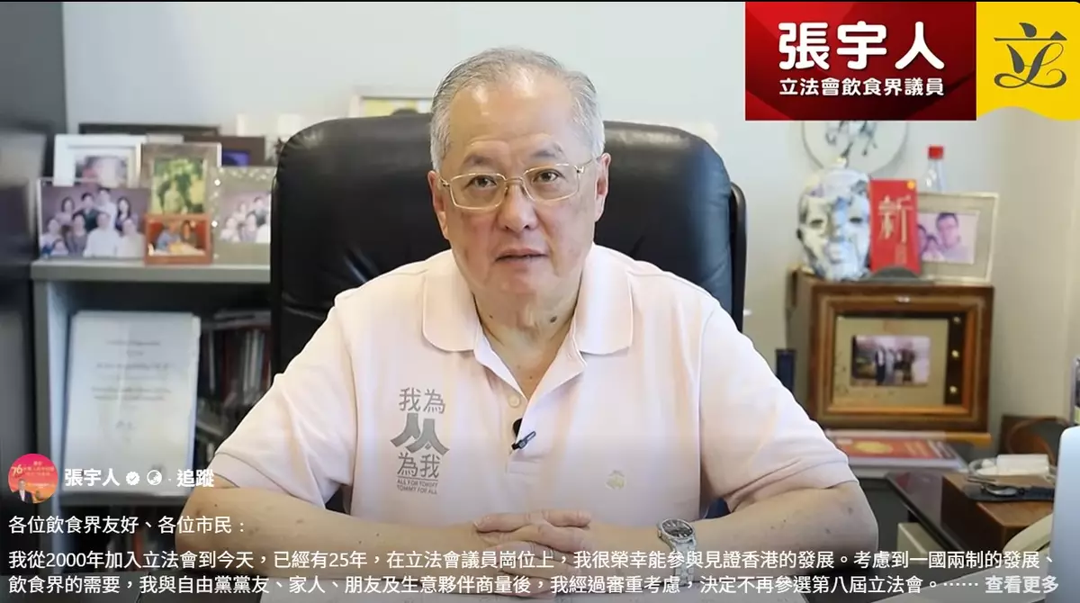 張宇人在社交平台發文和發短片表示,自己加入立法會至今25年,榮幸能參與見證香港的發展,經與自由黨黨友、家人、朋友及生意夥伴商量後,決定不再參選立法會選舉。