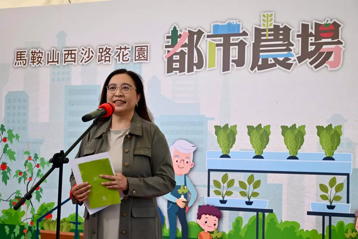 漁護署11日為首個位於馬鞍山西沙路花園的都市農場試驗項目舉行開幕典禮。環境及生態局常任秘書長(食物)楊碧筠在開幕典禮致辭。政府新聞處圖片