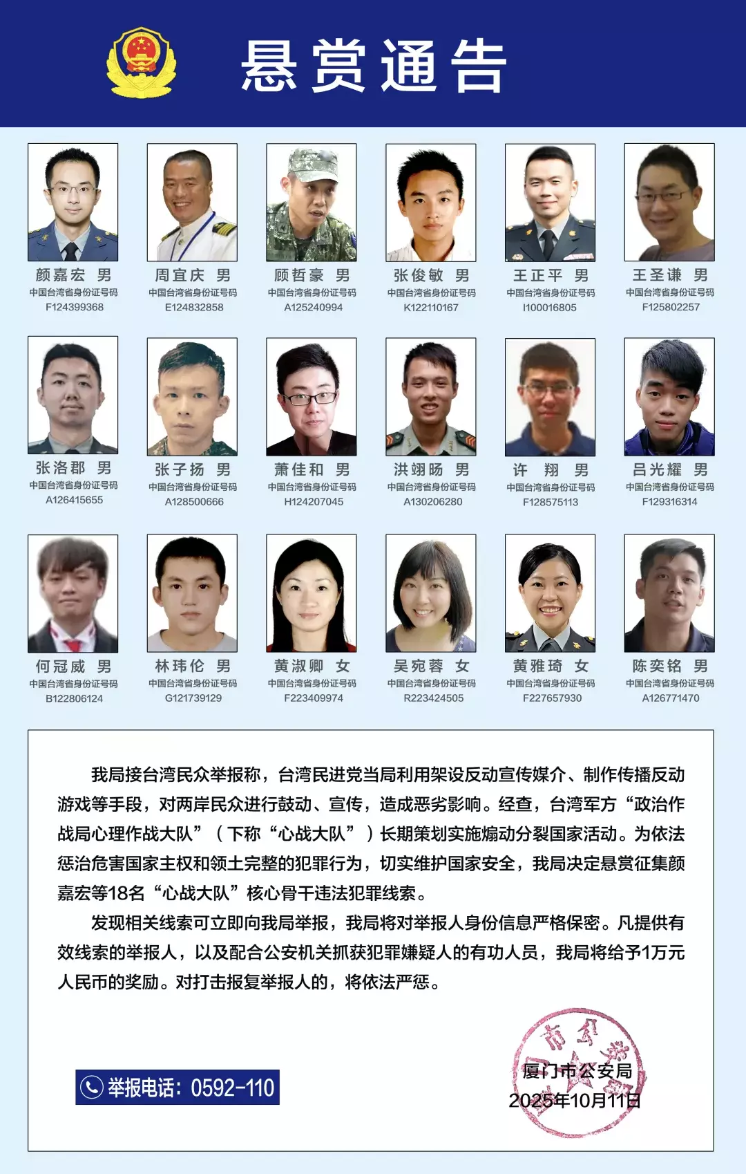廈門市公安局發布《懸賞通告》,向社會懸賞徵集18名台灣軍方「心戰大隊」核心骨幹違法犯罪線索,最高獎金一萬人民幣。