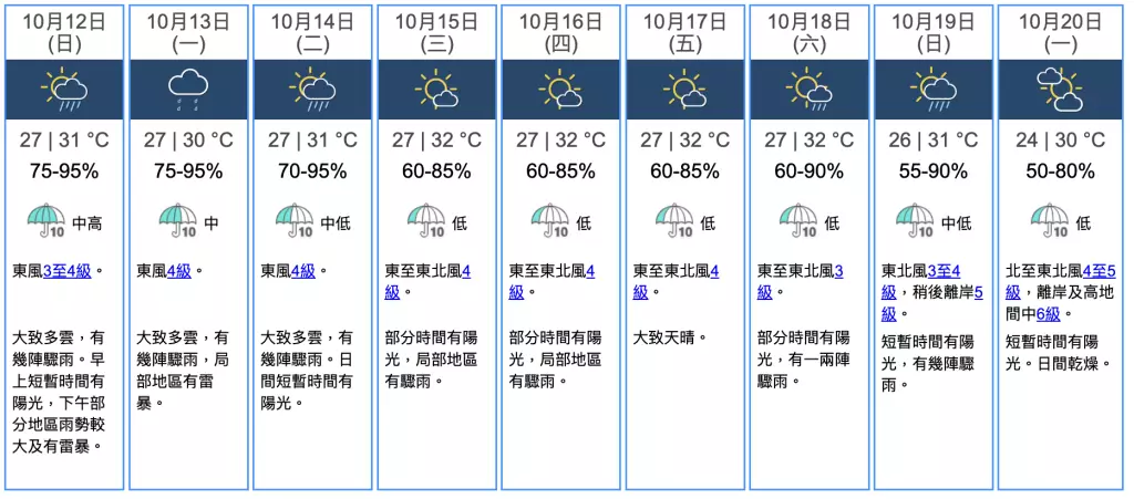 香港天文台表示,星期日大致多雲,有幾陣驟雨,早上短暫時間有陽光,下午部分地區雨勢較大及有雷暴,大家外出時記得帶定把遮傍身。